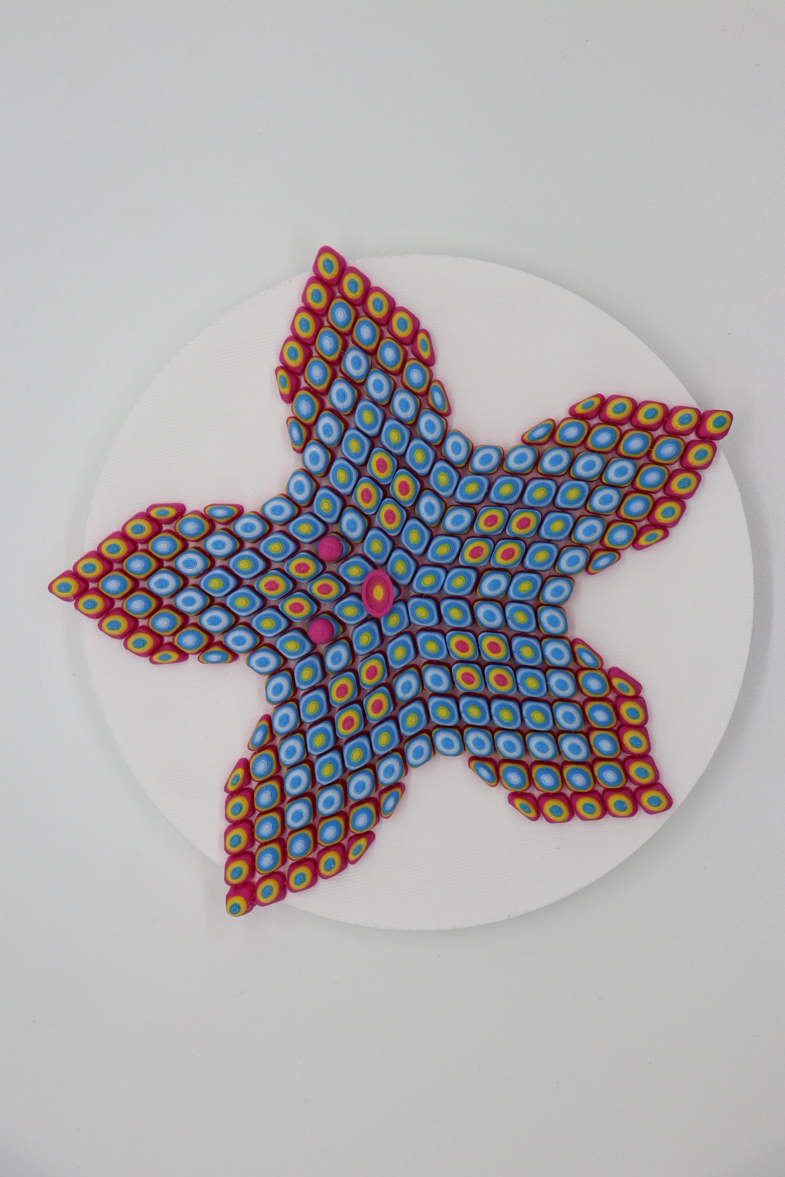 Bring ocean-inspired geometry to life with the Parabolic Starfish, a stunning blend of mathematical precision and playful color. Designed with intricate parabolic curves, each arm of the starfish features a mesmerizing pattern of vibrant blue, yellow, and pink concentric dots arranged in perfect symmetry.